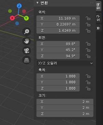 일단 먼저 언급을 하고 넘어가야 하는 것이 하나 있는데, 물체를 정말로 정밀하게 움직이거나 스케일링하거나 회전을 시키기 위해서는 N키를 누르면 나타나는 사이드 메뉴에서 항목이 있는데, 여기서 변환-transformation이라는 항목에서 일일히 지정하면 되기는 됩니다.