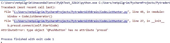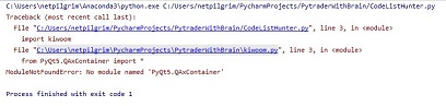 그런데, 문제는 위 스크린샷에서 보이는 것처럼 어떻게 된 것인지 PyQt5의 일부분이 없다는 식으로 에러메세지가 나오는 것 입니다.