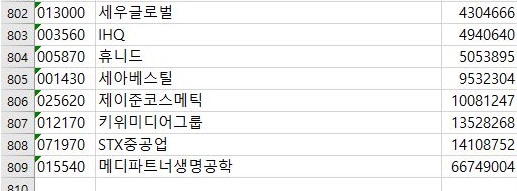 먼저 위 스크린샷과 가팅 일단 txt파일로 되어 있는 종목들을 엑셀에서 열도록 합니다. 당연하다면 당연하게도 ; 로 구분이 되기 때문에 다른 셀에 표시하는 것 까지는 문제가 없습니다.
