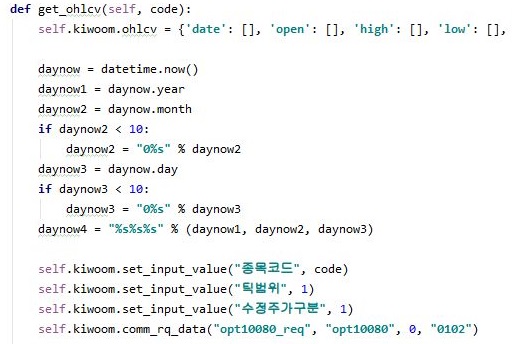 그리고 데이터를 받아오는 곳에서도 이제는 2 종목의 데이터가 아니라 1종목만 가지고 오도록 바꾸어 주도록 합니다. 그래서 코드 중에 상당수가 주석처리된 것을 볼 수 있습니다.