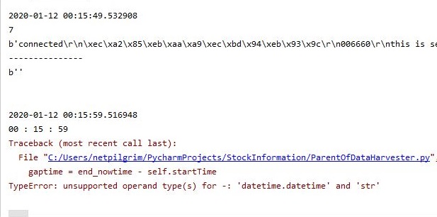먼저 문제라면 문제가 발생했습니다. 데스크톱으로는 코스피를, 노트북으로는 코스닥의 종목에서 데이터를 수집하고 있었는데, 문제가 발생했습니다. 원래라면 제대로 gaptime이라고 시작과 끝 시간을 계산해 주어야 하는데, 이게 안 나오고 에러가 나온 것 입니다.