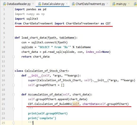 그리고 나서 메인이 되는 py파일로 가서는, 위 스크린샷에서 보이는 것처럼 py파일을 import해 오도록 하고, 이 import해 온 py파일의 클래스 안에 있는 메서드를 사용하도록 해 봅니다.