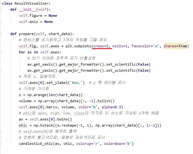 그리고 나서 기존에 RLTrader를 만들면서 옮겨서 사용했던 시각화 모듈의 메서드 하나를 통째로 뜯어오도록 합니다. 일단 이 부분은 분봉차트를 시각화 하는 부분이라고 할 수 있습니다.