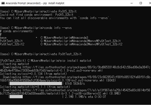 그래서 아나콘다 프롬프트를 실행시킨 다음. pip install 명령을 써서 matplot이랑 mpl_finance를 기존의 환경에 설치해 주도록 합니다.