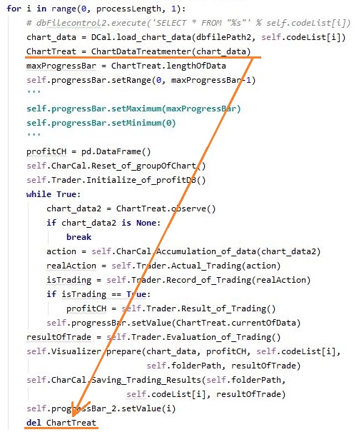 먼저 위 스크린샷을 보시면 for루프 안에서 클래스를 객체화라고 해야 할까 오브젝트로 만들어 주는 과정을 계속해서 반복하고 있습니다. 일단 이건 좋을 것이 하나도 없기 때문에 마지막에 가서는 del로 지워 주도록 합니다.