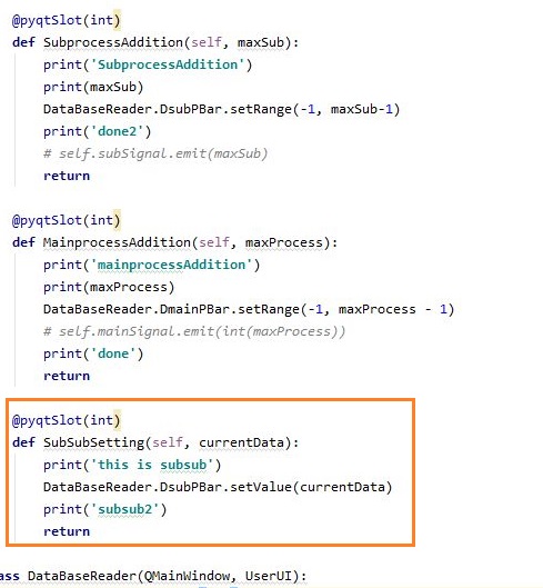 그리고 나서 다음으로 해야 할일은 위 스크린샷에서 볼 수 있는 것처럼 일단 뭔래라면 프로그레스바의 현재값을 지정해 주는 코드가 있어야 하는데, 그 부분은 주석처리를 하고, 대신 신호를 송출하기 위한 코드를 작성해 보도록 했습니다.