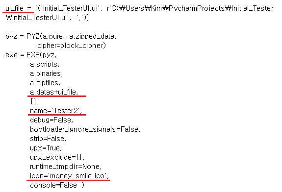 그리고 나서 추가로 해 주어야 하는 작업이 하나 있습니다. 위 스클니샷에서 붉은색으로 밑줄을 친 부분처럼 먼저 ui파일이 어디에 있는지를 튜플형태로 지정을 해 준 다음에, 이걸 이전에 one folder로 빌드할 경우에 있었던 COLLECT가 없고 대신에 exe에 있는 a.data에 플러스를 붙여서 더해 주도록 합니다. 그리고 나서, name= 이라는 항목에서는 나오게 될 exe파일의 이름을 지정하는 곳이며, icon= 항목은 추가한 것인데, 당연히 프로젝트의 폴더 안에 있는 ico파일을 가지고 오라는 의미가 됩니다.