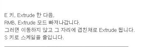 먼저 e키를 눌러서 extrude를 시켜야 하는데, 중요한 것은 여기서 돌출을 전혀 시키지 않고, 그대로 마우스 좌클릭을 해서 그냥 한번 윗면 위에 면하나 더 만들어 주는 것만 한다는 것 입니다.