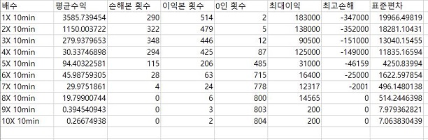 다만, 배수가 커지면 커질수록 손해를 크게 볼 일도 줄어든 다는 것을 알 수 있었습니다. 그 만큼 거래를 하지 않아서 큰 손해가 나오지 않는다는 것일까요?