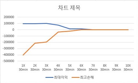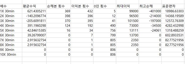 그리고 마지막으로 일단 최고 이익대 손해를 대비해서 보면, 3~4배 사이에 이익이 감소하는 폭은 손해가 감소하는 폭에 비하면 미미합니다. 다시 말하면 손해가 그 만큼 덜 나오는 것을 볼 수 있는데, 이래서 대체적으로 30분봉에선느 3~4배수 사이에서 고민을 해봐야 하는게 아닌가 하는 생각이 듭니다.