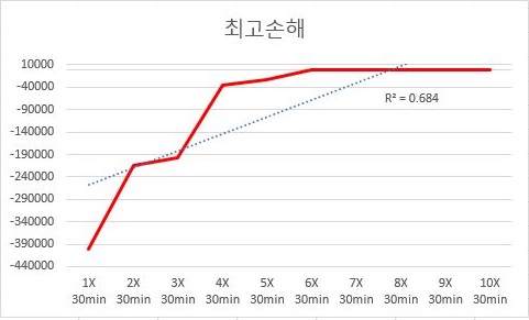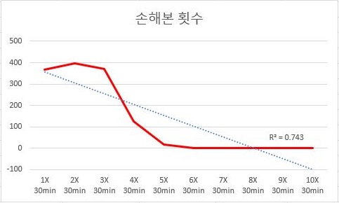 일단 30분봉 데이터를 이용해서 한번 손해본 횟수와의 관계를 살펴보니, 결정계수는 상대적으로 낮게 나왔습니다만, 문제는 4배수가 되면서 손해본 횟수가 상당히 많이 떨어진 것을 볼 수 있습니다.
