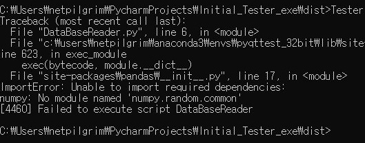 그리고 나서 다음으로 해야 할일은 위스크린샷에서 보이는 것처럼 cmd창에서 한번 실행을 시켜 보았습니다. 물론 그 이전에 windowed라는 옵션을 주는 식으로 해서 에러가 출력되도록 만들었는데, 위 스크린샷처럼 numpy의 일부 모듈을 가지고 오지 못해서 가지고 오는 에러라는 것을 알 수 있었습니다.