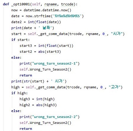 그리고 여기서 중간중간에 보이는 Wrong_Turn_Season2()라는 메서드를 자주 호출하는 것을 볼 수 있는데, 이게 키움증권 서버에서 항상 원활하게 정보가 오지 않아서 벌어지는 일이기도 합니다.