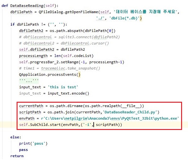 그래서 이번에는 좀 더 심화인 env경로만이 아니라, 아예 위 스크린샷처럼 먼저 waitForStarted()를 사용해서 먼저 시작하기를 기다려 주도록 합니다. 그리고 시작한 상태가 되면, QProcess.write()함수를 사용해서 자식 프로세스에 정보를 전달해야 합니다. 여기서 중요한 것은 뒤에 오는 closeWriteChannel()과 waitForFinished()라는 함수를 빼먹으면 오히려 작동이 잘 안됩니다.