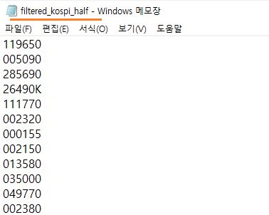 일단 해당하는 종목들을 위 스크린샷에서 보이는 것처럼 우선 새로운 txt파일에 두고나서, 여기서 한번 테스트에 들어가 보도록 합니다.