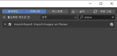 그전에 먼저 해야 할일은 환경설정으로 가서 애드온 메뉴에 plane아는 검색어를 입력해서 일단 이미지를 평면으로 가져오는 애드온을 선택하도록 합니다.
