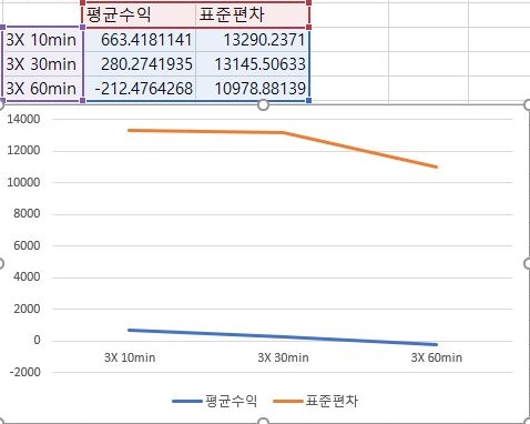 2배수 표준편차에서는 아예 위 스크린샷과 같이 마지막 60분봉을 기준으로 해서 결론을 내릴 경우에는 아예 이익과 손해의 갯수가 역전이 되는 것을 볼 수 있습니다.