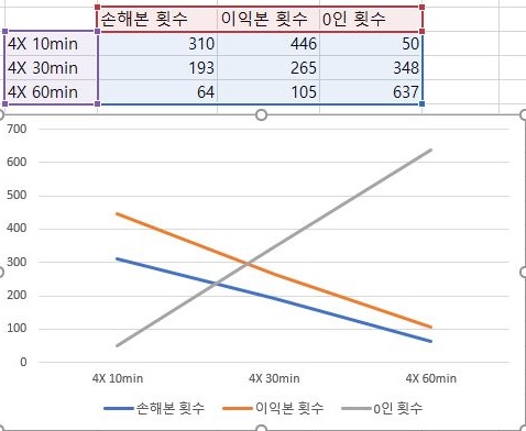 이제 손해를 본 종목의 갯수와 이익을 본 종목의 갯수를 한번 확인해 볼 시간인데, 일단 분봉의 간격이 넓어지면 넓어질 수록, 상황이 더 좋지 않아 진다는 것을 확인할 수 있습니다.