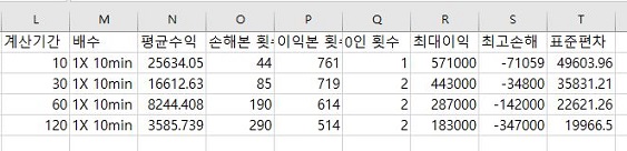 그리고 나서 여기서도 역시나 1배수때와 마찬가지로 계산에 동원된 분봉의 갯수가 많아지면 많아질 수록 이익은 적게 보고, 손해는 많이 본다는 현상이 지속되고 있습니다.