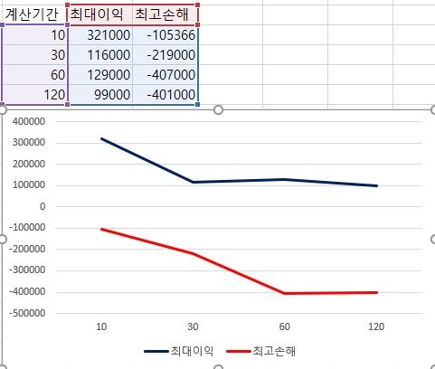 그리고 나서 다음으로 이익의 최대치와 손해의 최대치를 한번 비교해 보았습니다. 역시나 계산에 동원된 분봉의 갯수가 많으면 많을 수록, 표준편차에 1배수를 해준 경우에는 이익은 줄어들고, 손해는 커지는 것을 확인할 수 있었습니다.