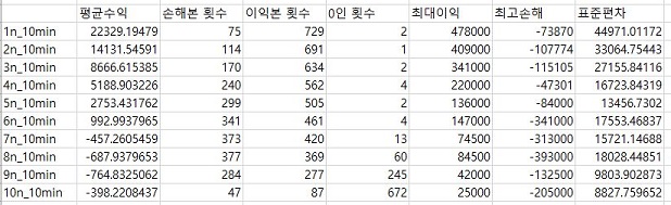 그리고 나서 다음으로 위 스크린샷과 같은 식으로 데이터를 모아서, 일단 10분봉 캔들 챠트 데이터 베이스에서 초기 테스트로 얻은 결과들을 모아 보았습니다.