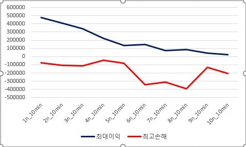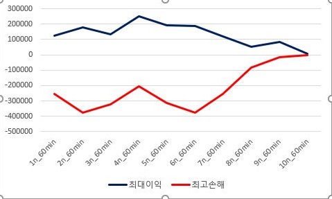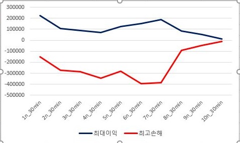 그리고 나서 최대로 본 이익이 꾸준하게 조건이 더 빡빡해 지면 질수록 떨어지고, 손해의 경우에는 1번 조건이 더 나을 정도로 상황이 그다지 좋다고 볼 수는 없습니다. 결국 1번 조건이 가장 좋고, 그게 아니라고 해도 5번까지는 그런대로 사용이 가능하라라 보입니다.