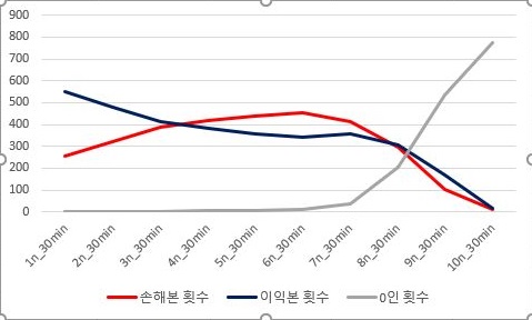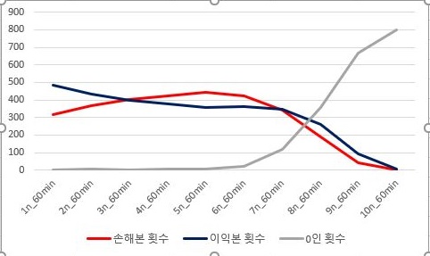 그리고 나서 손해를 본 횟수가 3번 조건부터 이익을 본 종목의 갯수를 넘어가고, 이게 다시 역전이 되는 시점에서는 거래가 전혀 없는 0인 종목의 갯수가 더 늘어난다는 것을 알 수 있습니다.