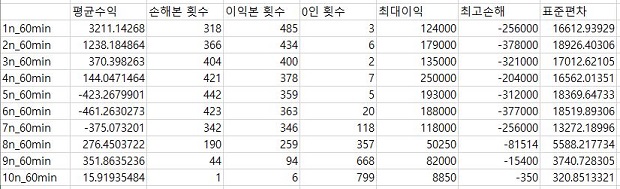 다음으로 알아봐야 하는 것은, 분봉간의 간격이 60분인 캔들 챠트 데이터 베이스로 초기 테스트를 해서 얻은 결과를 한번 나열한 도표를 작성하는 것 입니다.