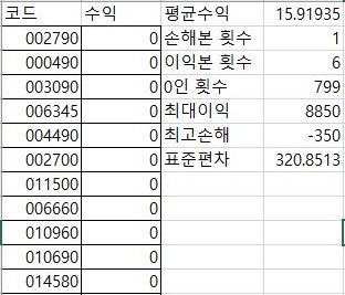 일단 이전의 결과와는 다르게, 6번 조건까지는 어떻게 평균수익이 나오는 것을 볼 수 있습니다. 다만 그 이후에 7번 조건부터는 아예 나오지 않기 때문에 그렇게 의미가 있다고 보기는 어려워 보입니다.