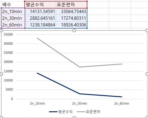 이어서 3번 조건에서 비교를 한번 해 보았습니다. 여기서 나오는 조건을 생각해보면, 30분봉 부터는 거의 평균수익이 바닥을 기어가기 시작하는 것을 볼 수 있었습니다.