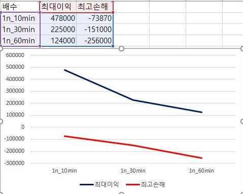 다음으로는 최대 이익과 최고 손해의 양을 한번 비교해 보았습니다. 일단 1번 조건에서 나오는 결과를 살펴보면, 뭐랄까, 분봉의 간격이 커지면 커질수록 점점 이익의 최대치는 낮아지고, 손해의 최고량은 올라가는 것을 볼 수 있습니다.