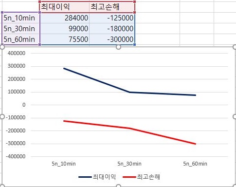 이제 이익의 최대치와 손해의 최대치를 비교하는 단계에 왔습니다. 일단 여기서는 60분봉으로 갈수록 이익의 최대치는 줄어들고, 손해는 증가하는 경향을 보였습니다.