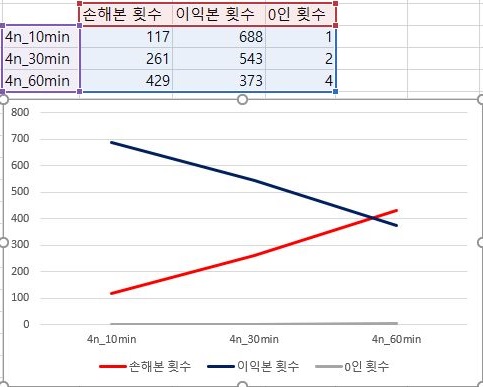 이 경향은 4번 조건에서도 이어지는 것을 볼 수 있습니다. 이익을 본 경우는 줄어들고, 손해를 본 경우는 늘어나다가 급기야 60분봉에 이르러서는 역전이 되는 것 입니다.