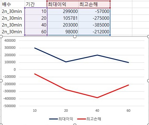 그리고 나서 마지막으로 60분봉 캔들챠트를 가지고서 얻은 내용을 가지고서 이익과 손해, 각각의 최대치를 얻도록 해 보았습니다. 여기서 얻을 수 있는 결과는 특별히 어떤 경향을 띄고 있다고 말하기 힘들었습니다. 이렇게 해서 2번 조건에서 변하는 내용을 비교분석해 보았습니다.