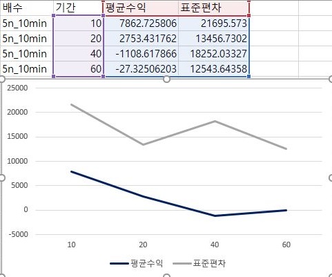 그리고 60분봉에서 얻은 데이터로 한번 비교분석을 평균수익과 표준편차를 보았는데, 상황이 심각하게 않좋은 것을 볼 수 있습니다.