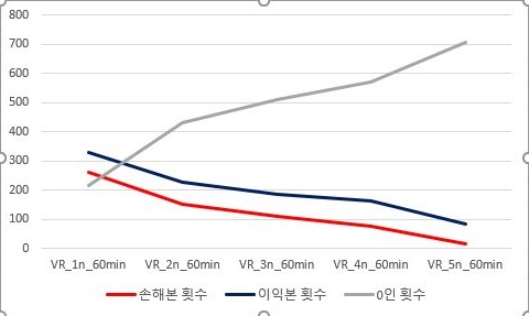 그리고 나서 최대로 본 이익의 크기와 최고로 본 손해의 크기를 한번 비교해 보았습니다. 여기서 나오는 양을 비교해 보면, 일단 널널한 조건에서는 이익과 손해의 최대치가 각각크지만, 이후엔느 너무 거래가 없어서 그 양마저 줄어드는 것이 아닌가 합니다.