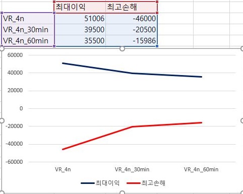 그리고 나서 위 스크린샷에서 볼 수 있는 것처럼 일단, 4번 조건에서 이익과 손해의 최대치를 한번 비교해 보았는데, 캔들챠트의 분봉 간격이 커지면 커질수록 손해는 줄어들지만, 이익도 줄어들고 있습니다.