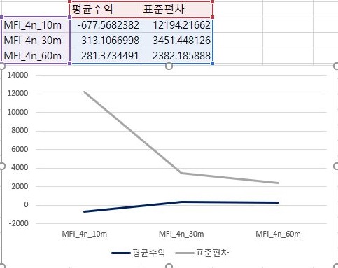 그리고 나서 이익과 손해의 최대치를 비교해 보고자 합니다. 일단 여기서 얻은 결과를 가지고서 설명을 하자면, 우선 이익은 크게 감소되지 않았지만, 손해는 극적으로 60분봉으로 가면 갈수록 감소하는 것을 볼 수 있었습니다. 이것으로 봐서 가장 널널한 조건에서는 왜 이렇게 60분봉에서 평균수익이 가장 큰 것인지 알 수 있었습니다. 다만 이렇다고 해도, 평균수익이 너무 작아서 다른 조치가 필요하다는 생각이 듭니다.