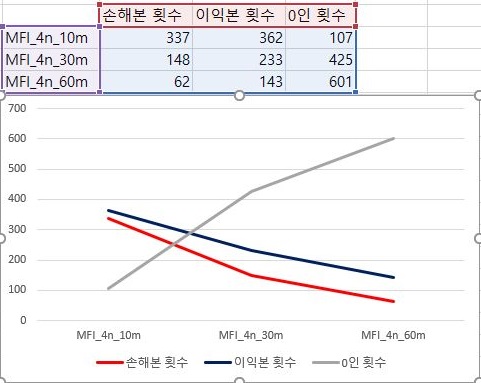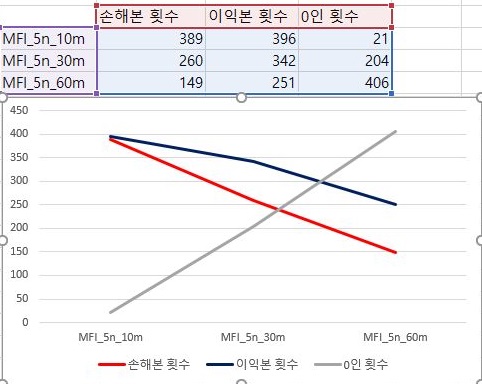 그리고 나서 이제는 손해를 본 종목의 갯수와 이익을 본 종목의 개수를 비교해 보면, 60분봉으로 갈수록 더 많은 종목이 거래가 없기 때문에, 30분봉에 비해서 평균수익이 떨어진 이유가 되는 듯 합니다.