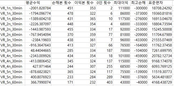 먼저 위 스크린샷에서 볼 수 있는 것과 같이, 일단 VR지수에 따른 매도/매수 룰을 테스트한 결과를 한번 도표로 정리해서 각각의 데이터 베이스 별로 모아 보도록 합니다.