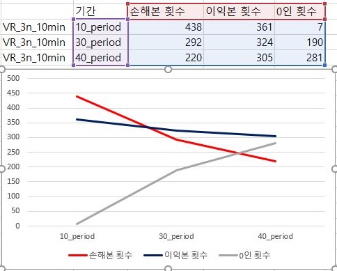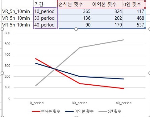 일단 손해를 본 종목의 갯수와 이익을 본 종목의 갯수를 한번 비교해 보기는 보았습니다. 일단 기간이 30period에 와서야 이익보는 종목의 갯수가 손해보는 종목의 갯수보다 더 많아졌으며, 이와 동시에 거래가 없는 종목의 갯수도 증가 했습니다.
