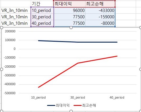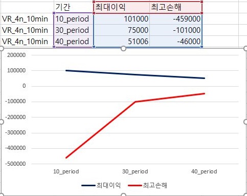 마지막으로 이익과 손해의 최대치를 5번 조건에서 살펴 보고자 합니다. 일단 여기서는 period가 길어지면 길어질 수록 점점 더 손해의 최대치가 줄어들지만, 이익도 어느정도 줄어든 것을 확인할 수 있었습니다. 일단 10분봉 캔들챠트 데이터 베이스에서 얻은 결과를 바탕으로 한번 확인해 보니, 여기서는 VR조건이 너무 평균수익부터 낮아서 사용하기 곤란하다는 생각이 듭니다.