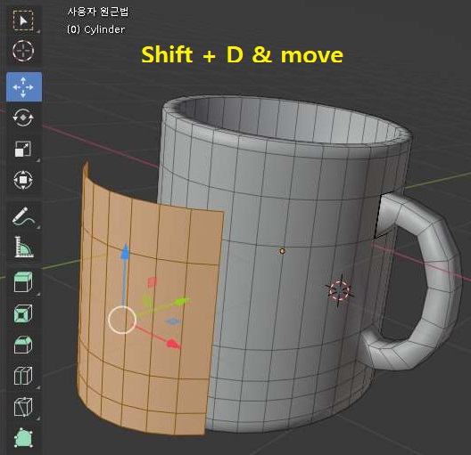 먼저 선택이 된 페이스들을 Shitf 키 그리고 D 키를 눌러서 복사를 해 주도록 합니다. 그리고 나서 이동할 수 있는 아이콘을 눌러서 위 스크리샷에서 볼 수 있는 것처럼 일단 이동을 시켜주는 작업을 하나 해 보도록 합니다.