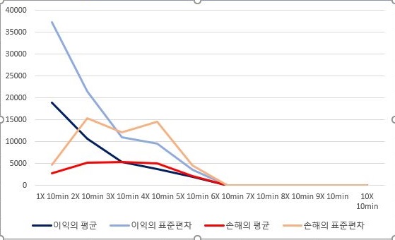 일단 이익과 손해의 표준편차에 대해서 한번 그래프를 그려보니, 우선 전체적으로 손해의 평균보다는 이익의 평균이 더 높은데, 표준편차에 가해지는 배수가 커지면 커질수록 가파르게 이익의 평균치가 내려가는 것을 확인할 수 있습니다.