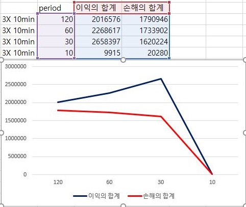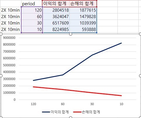 이제 표준편차에 2배수를 해준 결과에서 한번 작업을 해 보고자 합니다. 일단 여기서는 이익은 이전 그래프에 비해서 다소 기울기가 완만해 진 감이 있지만, period가 감소할 수록 분명히 증가하고 있고, 손해는 더 가파르게 감소하는 추세를 보이고 있습니다.