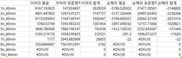 이렇게 하는 것도 이제 마지막으로 위 스크린샷을 보시면 이익과 손해만을 합쳐서 비교해 보았는데, 문제는 손해가 이전 초기 테스트의 결과들 보다 더 크게 나온 것 입니다. 일단 여기까지 각각의 데이터 베이스 별로 결과를 정리했는데, 다음 포스팅에서 이어서 60period 조건에서 캔들챠트 데이터 베이스 별 결과가 어떤지 비교를 하도록 하겠습니다.