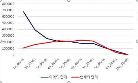 그리고 그 총합을 한번 비교해 보았더니, 일단 이익의 경우에는 처음에는 급격했고, 그 다음에는 꾸준히 그 합계가 줄어드는 것이 관착이 되었지만, 손해의 경우에는 조금씩 증가하다가 7번 조건 이후에나 완만하게 줄어드는 것을 볼 수 있었습니다.