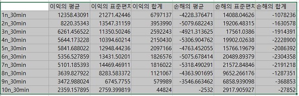 그리고나서 이번에는 30분봉 캔들챠트 데이터 베이스를 사용해서 나온 결과를 한번 정리해서 테이블로 만들어 보았습니다. 이 테이블을 바탕으로 해서 그래프를 그려야 합니다.
