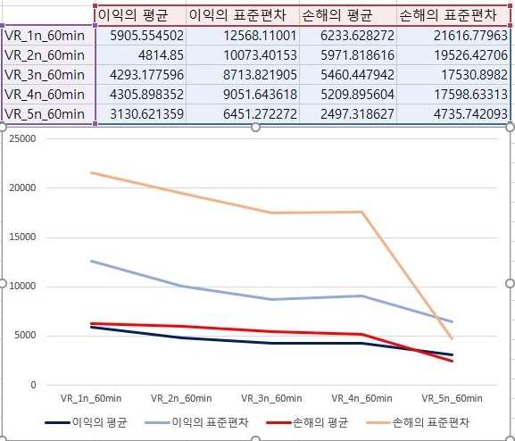 그리고 나서 다음으로 해야 하는 것으로는 이익을 본 종목과 손해를 본 종목만을 추려서 그 평균을 구한 것인데, 일단 여기서는 가장 빡빡한 5번 조건을 빼고는 언제나 손해의 평균이 이익의 평균보다 컸으며, 이는 유의해야 할 점으로 보입니다.