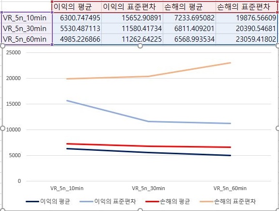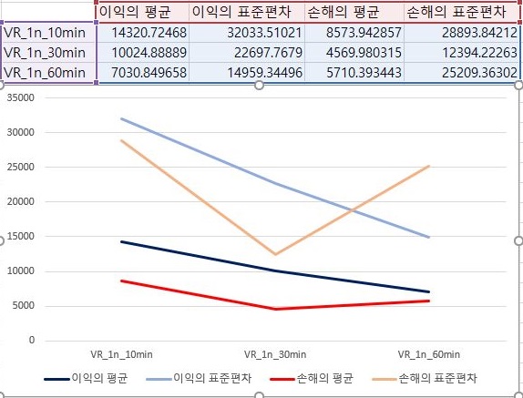 먼저 1번 조건에서 한번 이익과 손해만을 모아서 평균과 표준편차를 내 보았더니, 여기서는 캔들챠트의 분봉 간격이 커지면 커질수록 점점 그 이익의 크기가 줄어드는 것을 확인할 수 있었습니다.